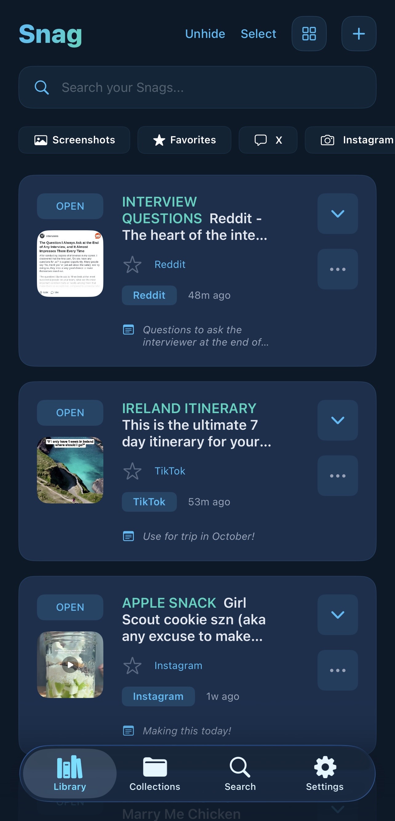 Everything you save lives in your personal library. Star your most important snags to add them to Favorites for instant access.
